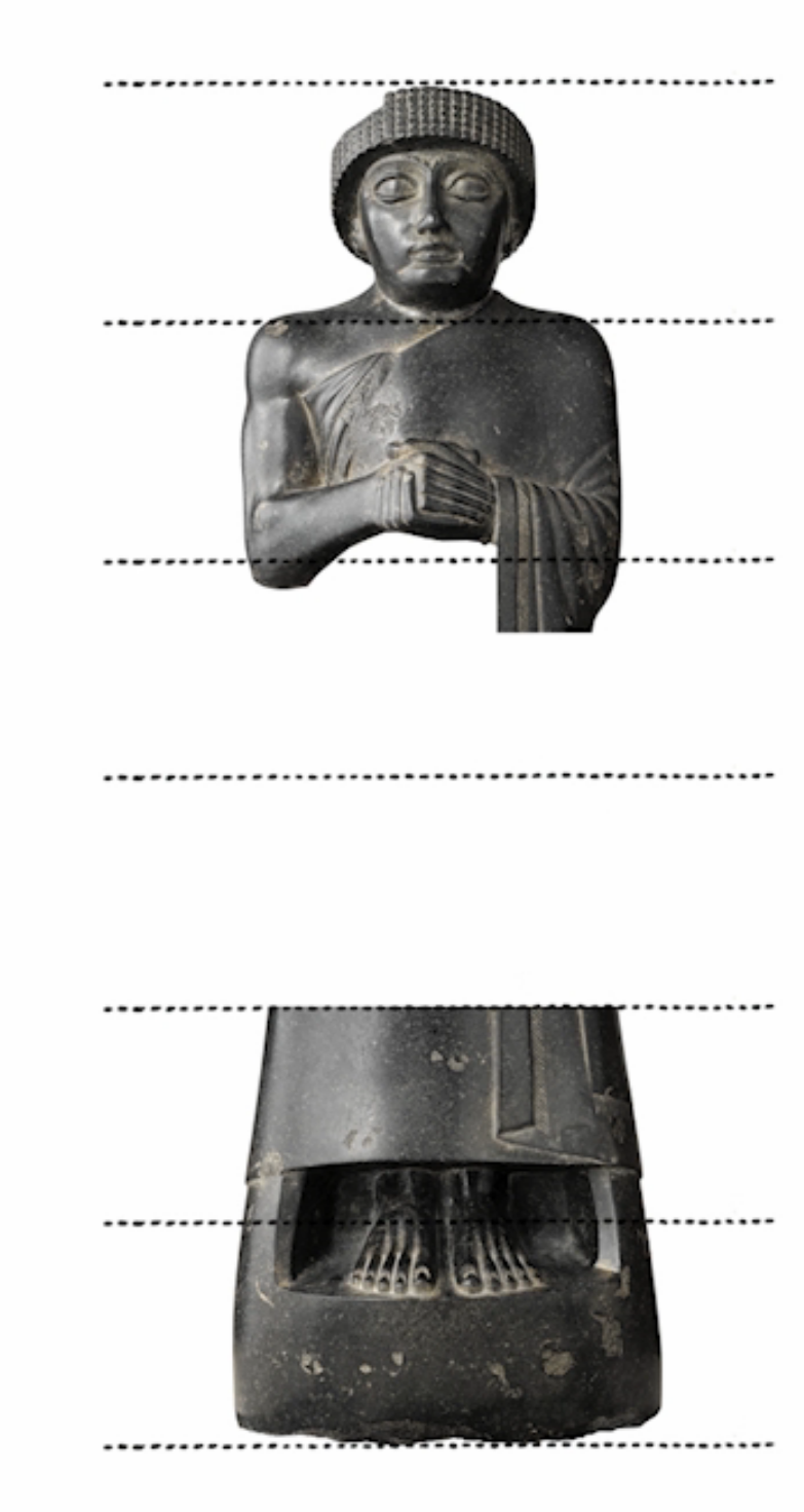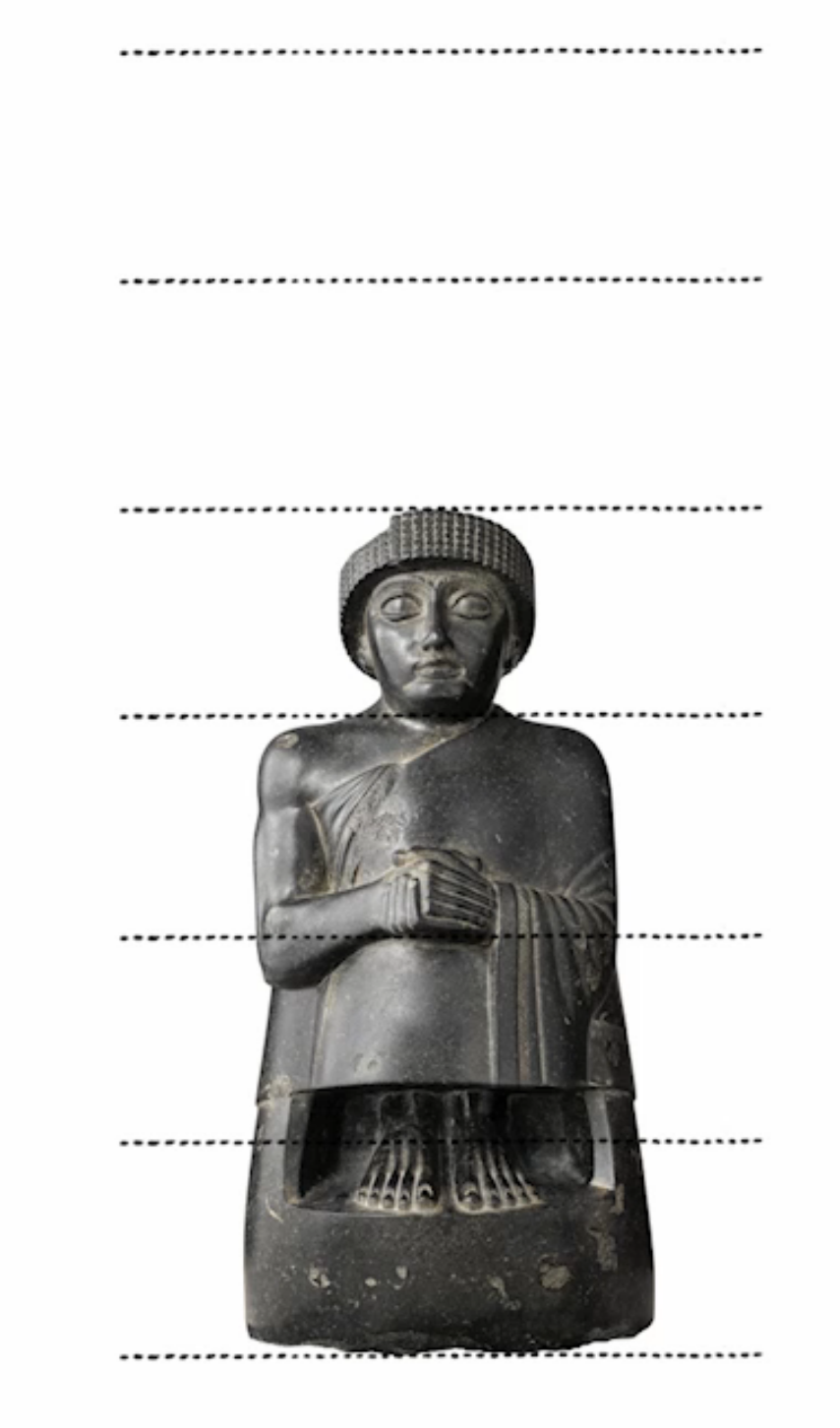 하지만 앉아있는 모습과 서있는 모습에도 일정한 비례가 적용되어있는데요, 서있는 구데아 조각상은 일정하게 6등분으로 나누어지며 좌상의 형태는 정확하게 서있는 조각상의 3분의 2 비례인 것을 볼 수가 있습니다.