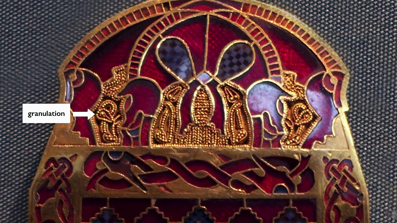 그리고 이 어깨 장식용 걸쇠 상단 부분은 조그마한 황금 알갱이들로 꾸며져 (Granulation) 있는 것으로 보아