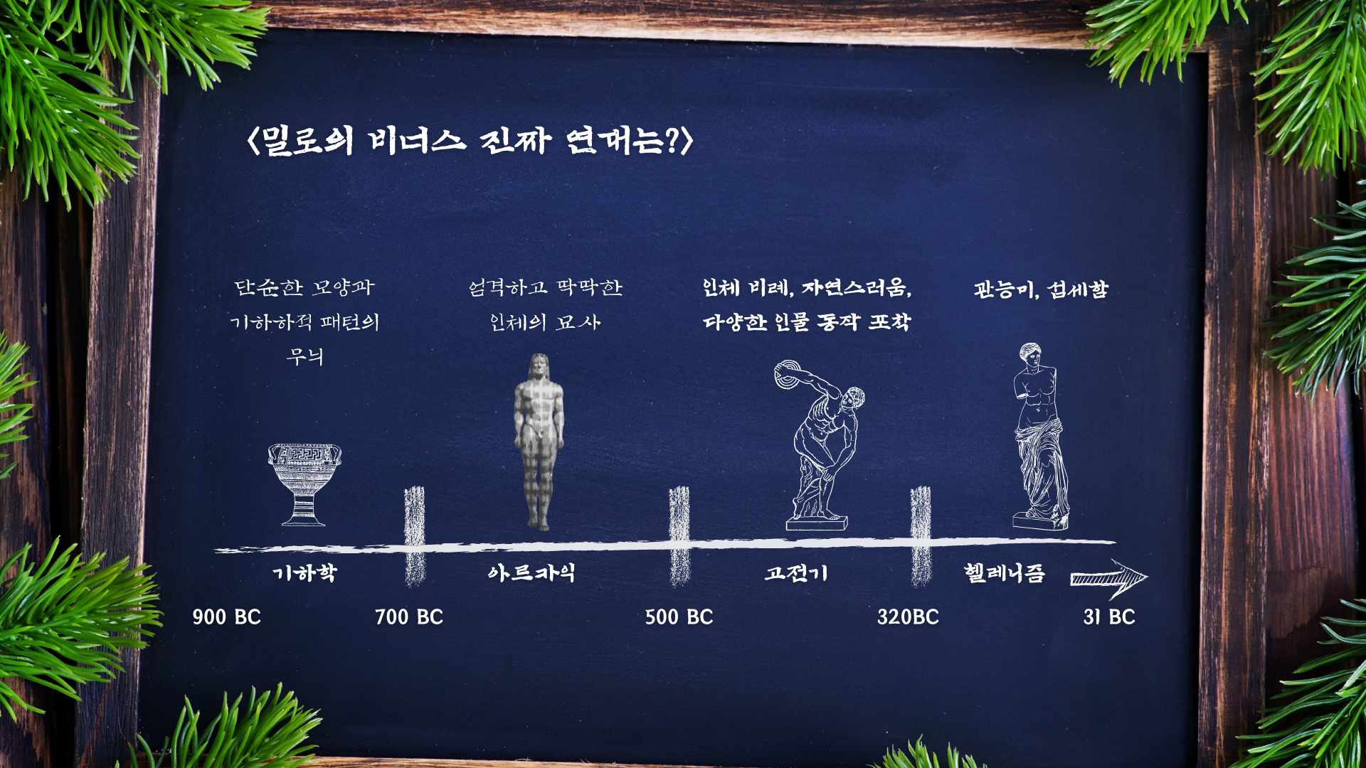 고대 그리스 미술은 시대적으로 총 네 가지 양식으로 구분됩니다. 가장 오래된 순서부터, 단순한 문양과 기하학적 무늬의 반복적인 패턴이 주요 특징인 지오메트릭, 그리고 엄격하고 딱딱한 인체의 묘사가 특징인 아르카익, 인체의 비례와 자연스러움 그리고 다양한 인물의 동작들을 실험한 고전주의 그리고 인체 특성에 대한 섬세함과 관능미가 추가된 헬리니즘 양식이 있습니다.