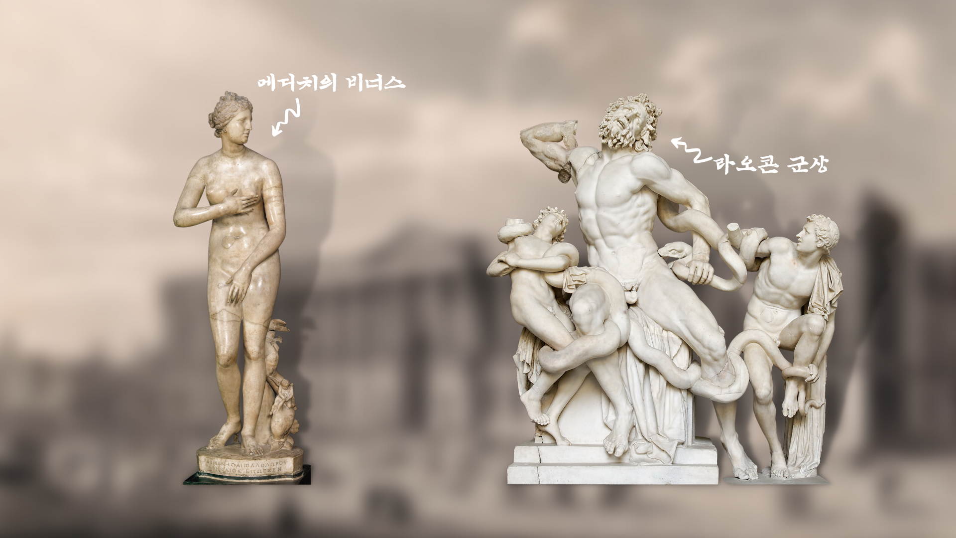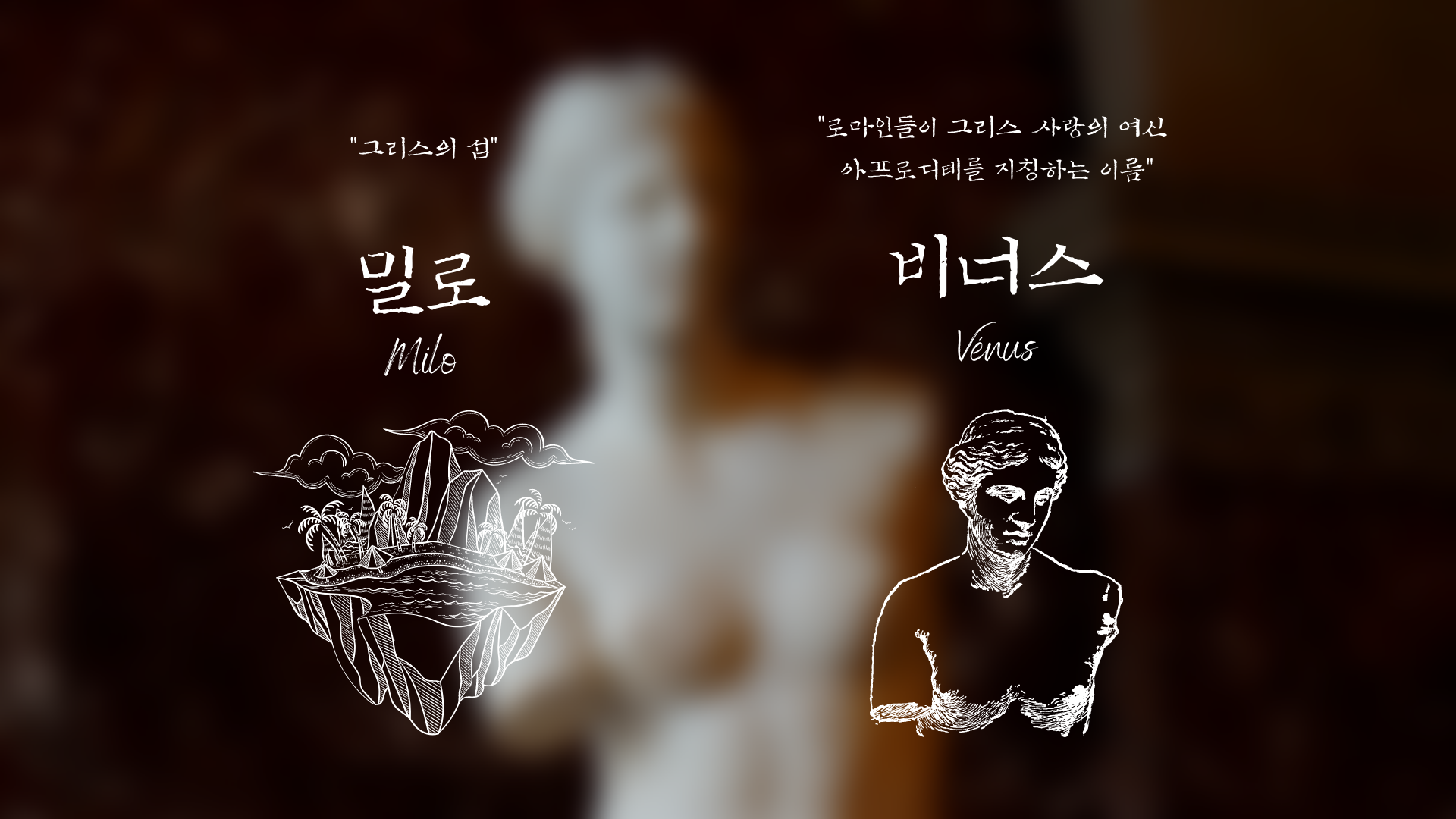 루브르 박물관 한 켠에 신비로움을 풍기며 홀로 외롭게 서있는 곱슬거리는 단발머리를 한 반라의 여신상이 보입니다. 입은 굳게 닫혀 있고 알 수 없는 표정을 지으며 어느 한 곳을 멀찍이 지켜보고 있습니다. 반쯤 허리에 걸쳐진 주름 많은 천은 금방이라도 흘러내릴 것만 같이 아슬 아슬해 보이고, 잘려나간 양팔은 이 여신상이 도대체 어떤 동작을 취하고 있었는지에 대한 궁금증을 유발합니다. 지금 보시는 조각상은 그 유명한 고대 그리스 헬레니즘 시대의 최고 걸작 중 하나인 "밀로의 비너스" 입니다.