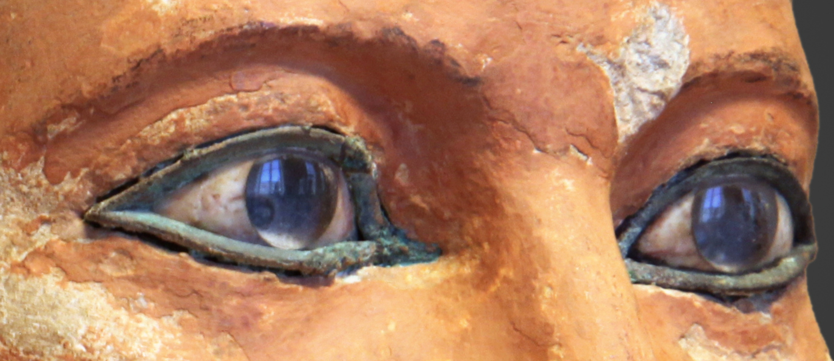 무엇보다도 이 조각상의 가장 두드러진 특징은 얼굴에 있는데요, 아주 정교하게 조각된 눈은 백색의 마그네사이트로 된 흰자와 다듬어져있는 크리스탈이 박혀있는 동공이 있으며 미세하게 묘사되어있는 붉은색 핏줄과 홍채가 보입니다. 그리고 눈 주위로는 검게 칠한 구리가 접합되어있습니다.